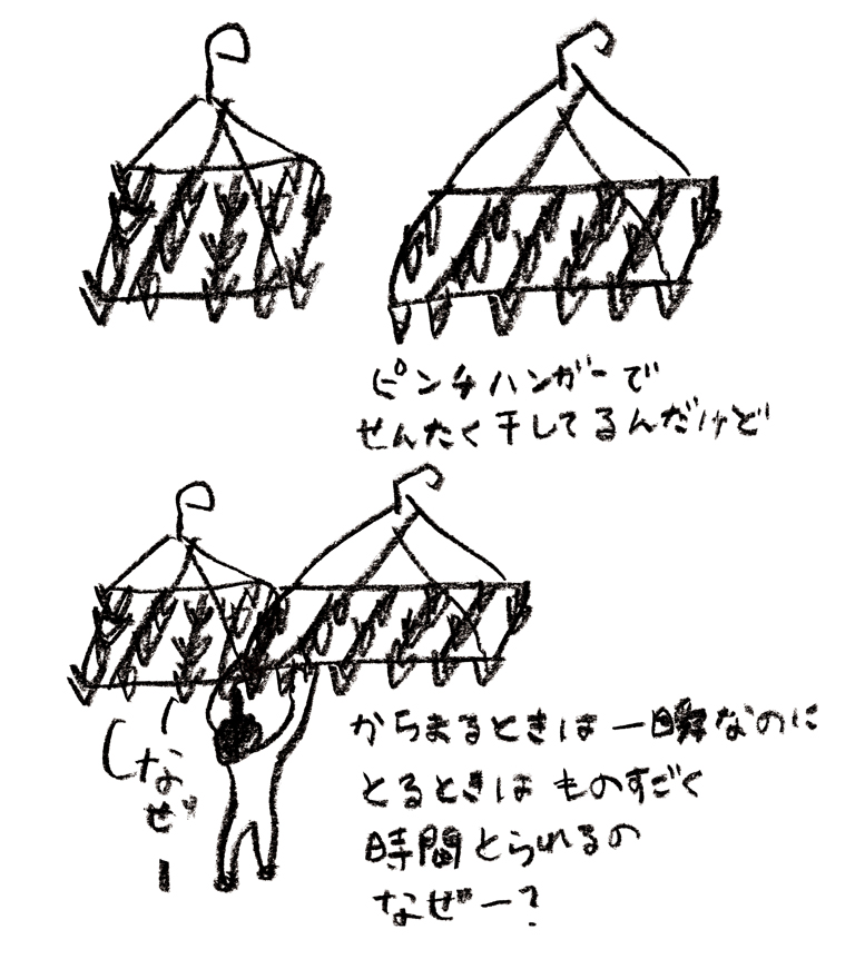 洗濯物干すために ワイヤーのピンチハンガーを使用しています。 シンプルで好きなのですが、はずみで隣のハンガーとからむのは一瞬の出来事なのに、はずすのに信じられないくらいの時間がかかります。 いつもなぜだろう?と考えている。 何かと似ている気がするのよねこの現象。