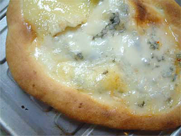 薄くのばして、5分空焼きし、ブルーチーズと少しモツァレラものせて焼く。