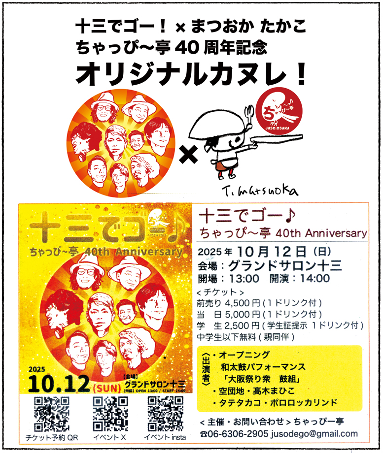 十三(じゅうそう)の名所になりつつある キャバレーであり、イベントスペースの 『グランドサロン十三』で 『十三でゴー♪』が10月12日(日)開催されます。 お馴染みのアーティストはもちろん、 今回は有名な和太鼓集団のパフォーマンスや 映画『誰も知らない』の音楽を担当された タテタカコさんも出演されます。 (実は映画にも出演もされていたのですよ。) そして!まつおかカヌレも参入させていただくことになりました。 もちろん、本人うろうろのりのり(踊っているかも) しておりますので会場で見かけたらお声かけくださいませ。 では、日曜日に十三でお会いしましょう!